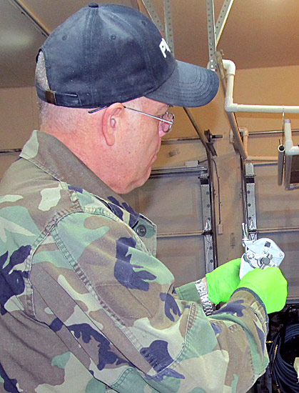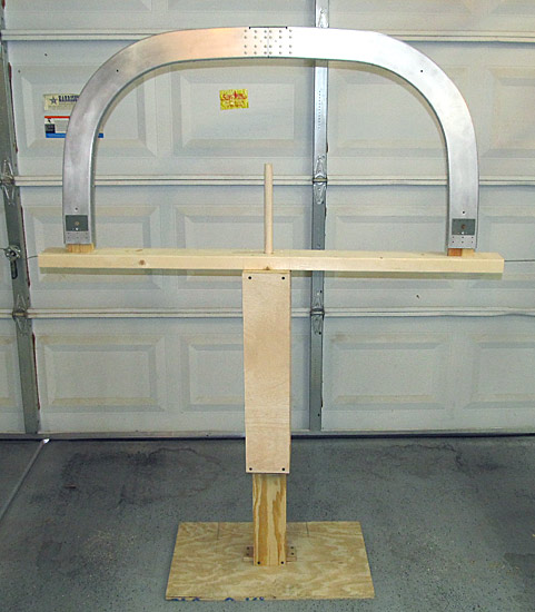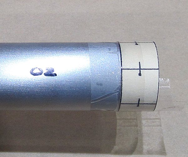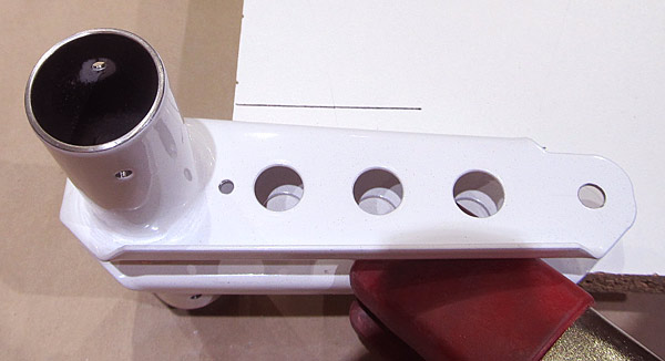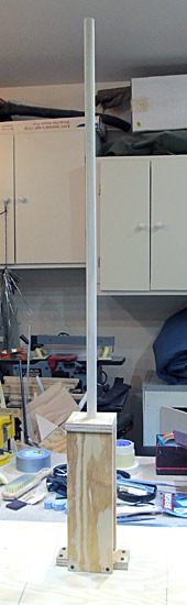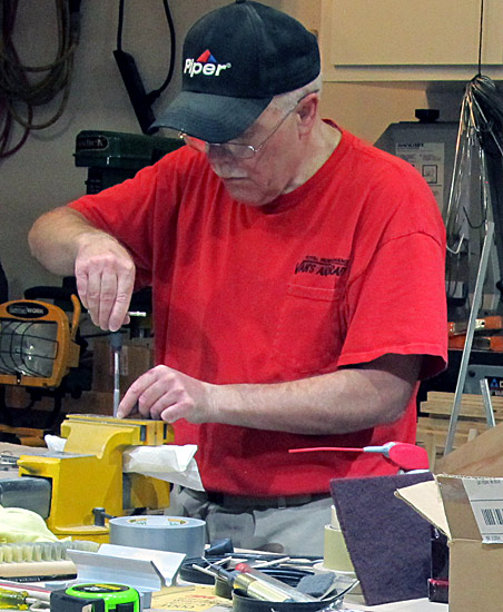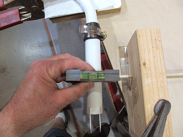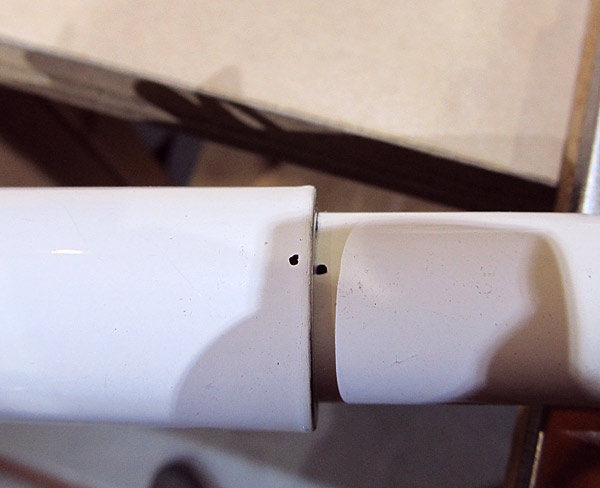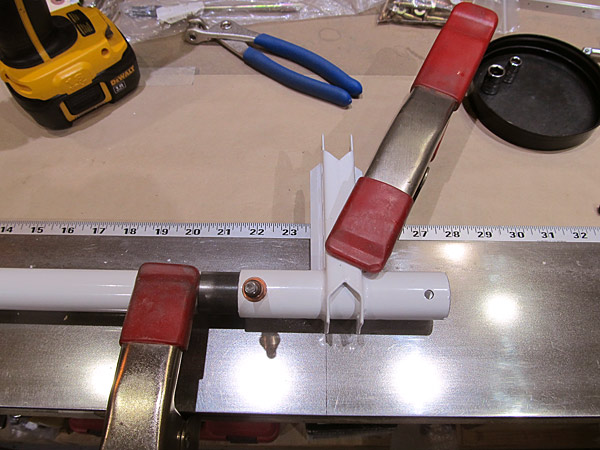 Figure one, page 56-02 of the builder's manual, gives additional information in the construction of the two (CS-00017 and CS-00019) autopilot pitch and roll pushrods. A #3 hole is to be drilled through the center of each end of each tube to a depth of 1 1/4". Obviously this needs to be centered as much as possible so I constructed a simple jig by drilling a 5/8" hole in a scrap piece of 2"x4" lumber with the drill press in order to hold the tube vertically. This made it easy to keep the tube centered while drilling the #3 hole down the center of the tube with our drill press.