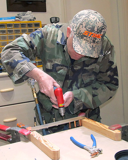 *Make sure you don't drill the 5/8" hole all the way through the 2"x4" wood because you need the tube to be able to rest on the bottom flat area of the wood, plus the extra friction helps keep the tube from spinning as the #3 hole is being drilled in the tube.